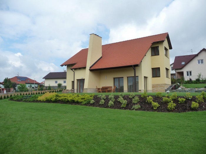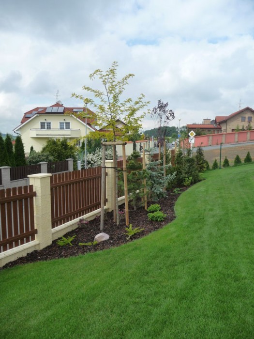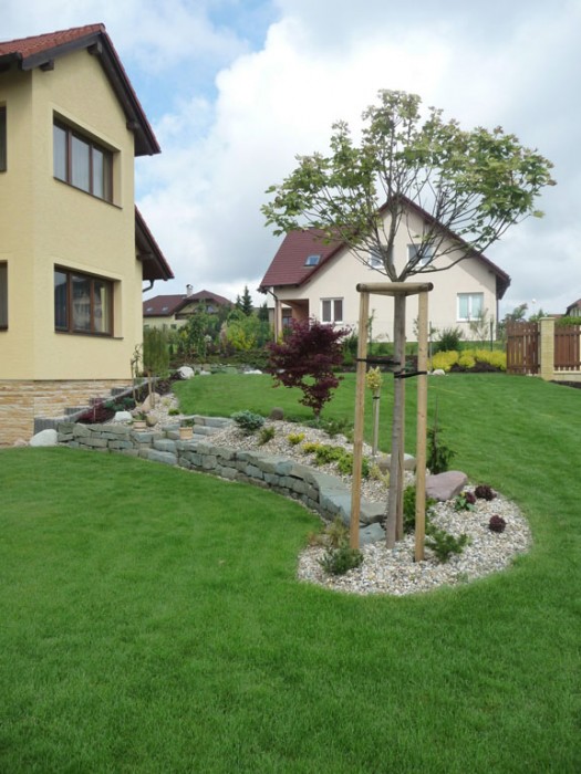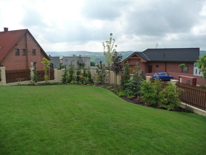 Majitel byl s naší prací natolik spokojen, že se rozhodl svěřit nám založení celé zahrady. Základem se stal projekt včetně 3D vizualizace. Na přání klienta rozložit finanční investici, jsme zahradu realizovali v několika etapách během následujících dvou let. První etapu představovala výsadba okrasných rostlin u vstupu do domu a založení trávníku na zbytku pozemku.