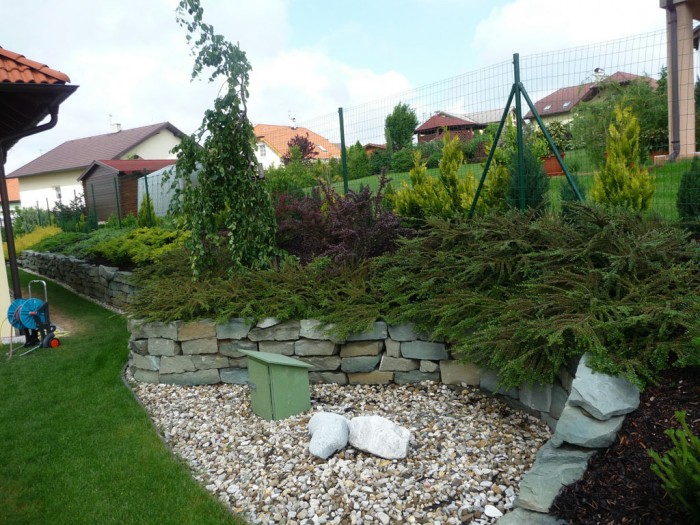 Zahrada u novostavby rodinného domu se nachází ve vilové oblasti Krásného pole na okraji Ostravy. Prvním zadáním ze strany majitele bylo vyřešení asi metrového převýšení terénu na severní straně domu. Tento požadavek jsme splnili stavbou suché zídky z opracovaného pískovce a nad ní vysadili kombinaci různě barevných rostlin. Jejich funkce je okrasná a protierozní.