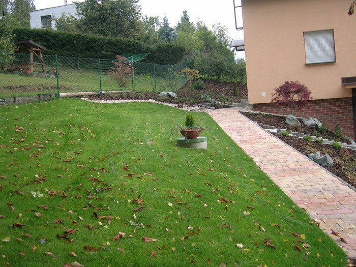 Z důvodu okamžitého estetického efektu a zabránění splavování zeminy v kopcovitém terénu, jsme po dohodě s majitelem zvolili položení předpěstovaného trávního koberce. Díky spokojenosti klienta s pracemi během realizace, provádíme také komplexní údržbu zeleně, dle námi vypracovaného harmonogramu.